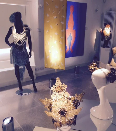 There is still time to go and see this wonderful small exhibition if your in Gloucestershire at ACP, canvas for creativity. Philip Treacy 's Gold Lace Swarovski Full Mask in the foreground, Adnan Bayyat "Paperclip Dress", to the left and on the right Peter Pullen's "Fox". In the foreground of the 2nd photograph is Alexander McQueen's " Lamb's Wool Corset". My Oil painting "stripped by blue" and textile hanging "stripped by red and yellow are at the back centre of both. Really thrilled to be showing with these wonderful creators.